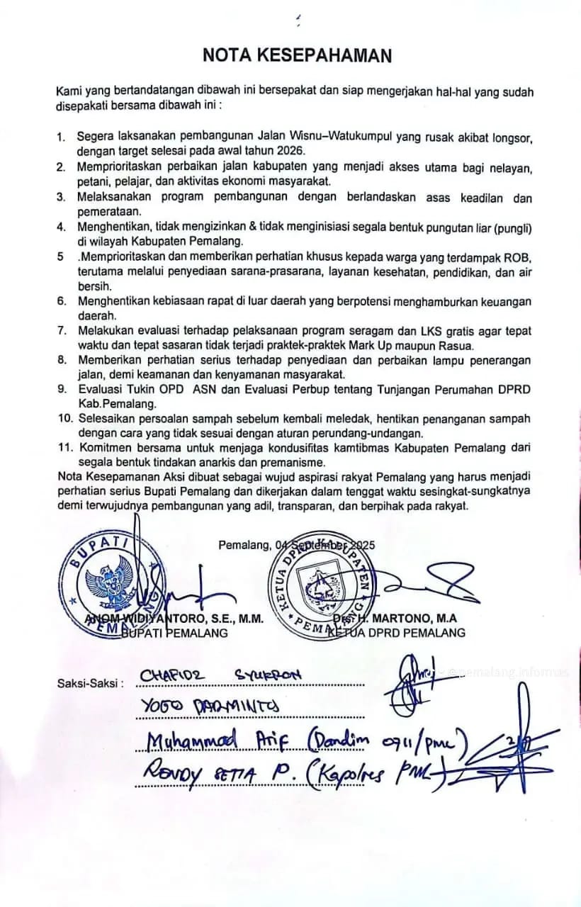 Aksi damai yang digelar masyarakat Pemalang berakhir dengan hasil menggembirakan. Pemerintah Kabupaten Pemalang bersama DPRD Pemalang menandatangani Nota Kesepahaman berisi 11 poin kesepakatan sebagai jawaban atas aspirasi warga.