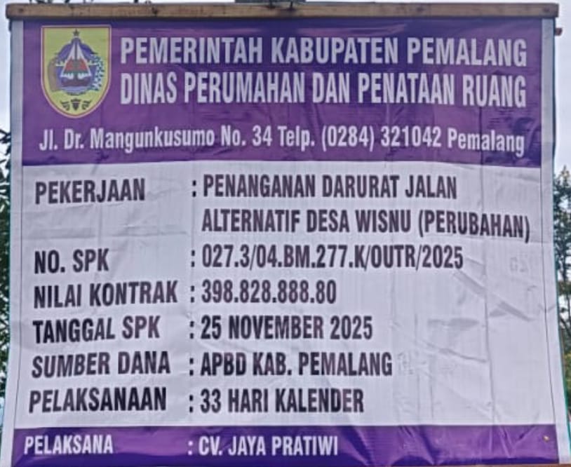 Berdasarkan data pada papan informasi proyek di lokasi, pekerjaan tersebut merupakan agenda Dinas Perumahan dan Penataan Ruang Kabupaten Pemalang dengan judul pekerjaan “Penanganan Darurat Jalan Alternatif Desa Wisnu (Perubahan)”. Proyek ini menelan anggaran sebesar Rp 398.828.888,80 yang bersumber dari APBD Kabupaten Pemalang Tahun Anggaran 2025.
