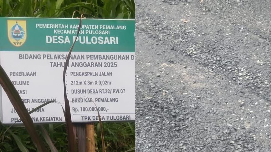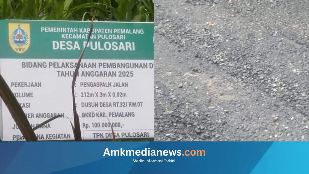 Pemalang | Amkmedianews – Proyek pengaspalan jalan di RT 32/07, Desa Pulosari, Kecamatan Pulosari, Kabupaten Pemalang, telan anggaran Rp100 juta, dikeluhkan warga. Hasil pekerjaan dinilai tidak sesuai standar dan diduga dikerjakan secara asal-asalan.