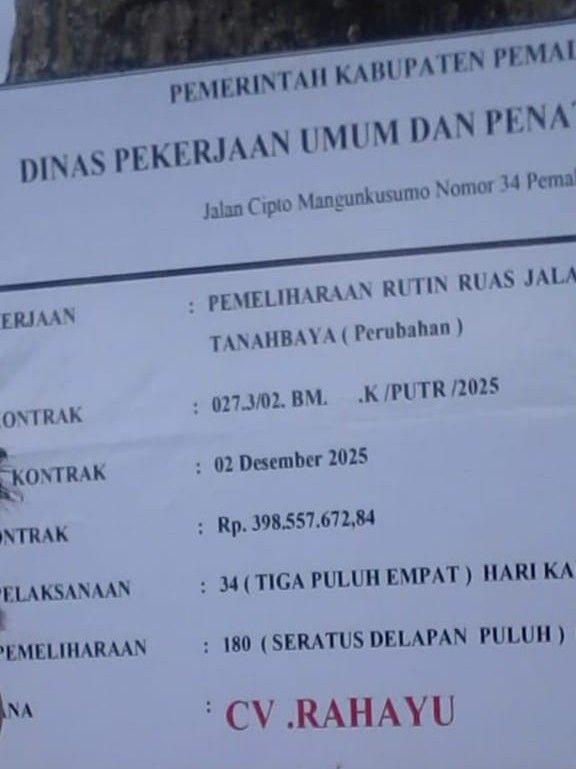 Pemalang |Amkmedianews.com-Pelaksanaan proyek Pemeliharaan Rutin Ruas Jalan Tanahbaya (Perubahan) menuai sorotan masyarakat. Sejumlah pihak menduga adanya kejanggalan dalam proses pengerjaan proyek tersebut, baik dari aspek teknis pekerjaan maupun transparansi pelaksanaan di lapangan.