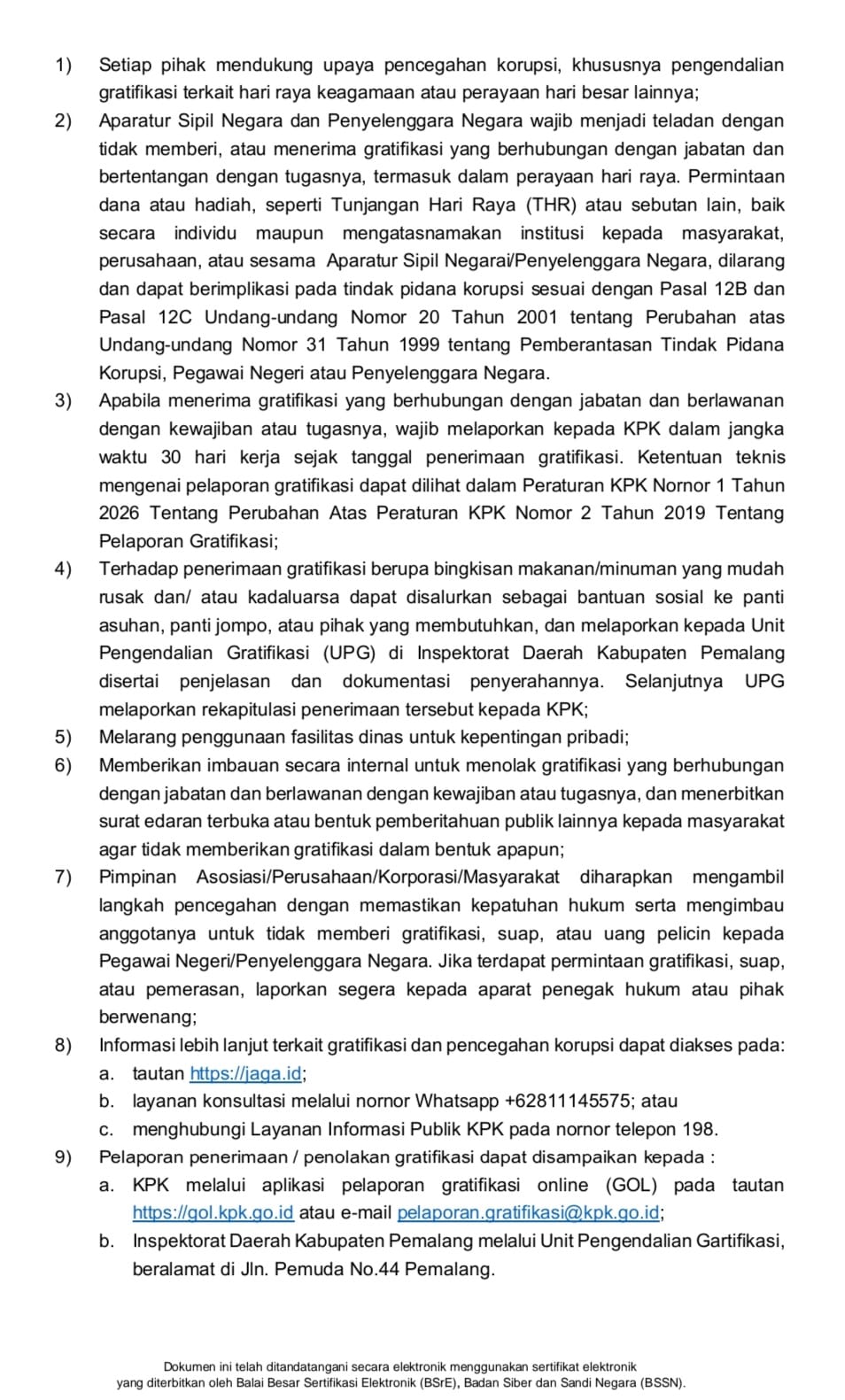 Dalam keterangannya, Pemkab Pemalang memberikan peringatan serius mengenai larangan permintaan dana atau bingkisan, seperti Tunjangan Hari Raya (THR), baik secara individu maupun institusi. Tindakan meminta hadiah kepada masyarakat, pelaku usaha, atau sesama ASN dinilai melanggar kode etik dan berpotensi masuk ke ranah pidana.”Penyelenggara negara wajib menjadi teladan. Segala bentuk permintaan yang bertentangan dengan kewajiban tugas dapat berimplikasi pada sanksi hukum sesuai Undang-Undang Pemberantasan Tindak Pidana Korupsi,” tegas isi edaran tersebut.