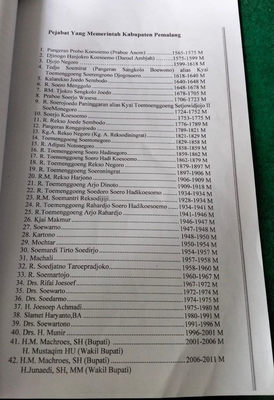 Berdasarkan catatan sejarah resmi, jejak kepemimpinan di Pemalang telah dimulai sejak abad ke-16. Nama Pangeran Probo Koesoemo (Praboe Anom) tercatat sebagai pembuka silsilah pemimpin Pemalang pada tahun 1565–1575.