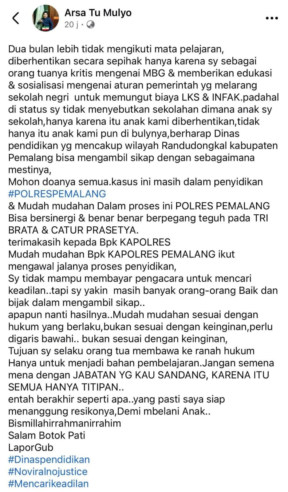 Melalui unggahan di media sosial, orang tua tersebut menyebut anaknya telah lebih dari dua bulan tidak mengikuti kegiatan belajar mengajar. Ia menduga pemberhentian itu berkaitan dengan sikap kritisnya terhadap dugaan pungutan di sekolah, seperti biaya LKS dan infak, yang menurutnya tidak diperbolehkan di sekolah negeri.