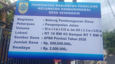 Pemerintah Kabupaten Pemalang melalui Pemerintah Desa Semingkir, Kecamatan Randudongkal, mulai melaksanakan pekerjaan pengaspalan jalan sebagai bagian dari program pembangunan desa tahun 2025. Kegiatan ini menggunakan anggaran APBD Provinsi 2025 dengan nilai Rp 200 juta, ditambah swadaya masyarakat sebesar Rp 2 juta.
