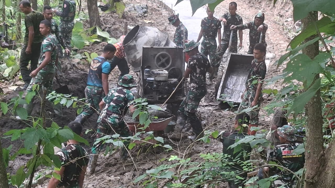 Tantangan alam yang tidak bersahabat, mulai dari tanjakan curam hingga cuaca yang berubah drastis dari panas menyengat ke hujan lebat, tidak mematahkan semangat para personel. Karena lokasi yang sulit dijangkau kendaraan besar, pengangkutan material bangunan terpaksa dilakukan secara manual oleh para prajurit di lapangan.