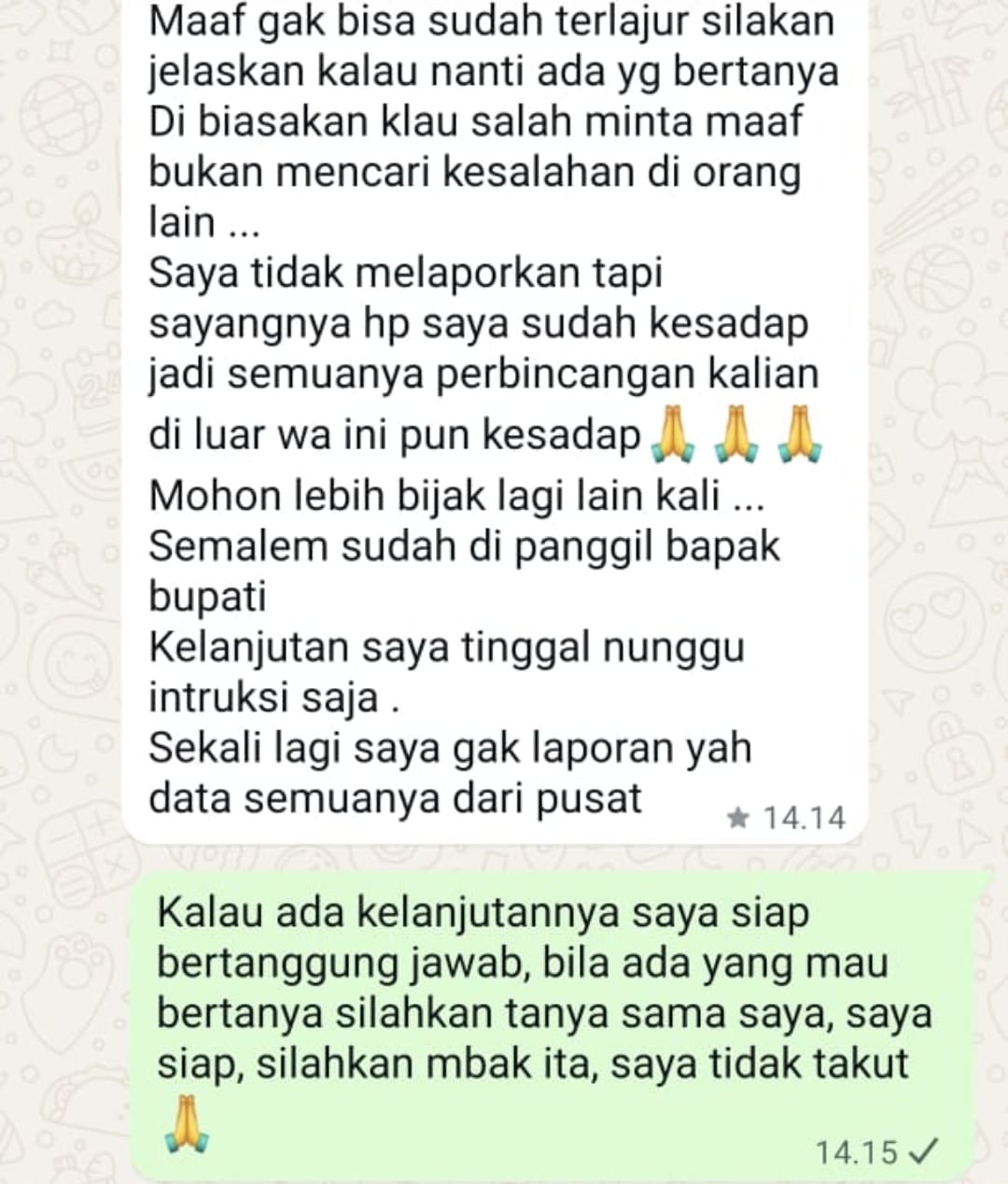 Di samping isu roti, Kepala Sekolah Wulandari juga memberikan klarifikasi tegas mengenai dua isu kontroversial lain: Pengeluaran Wali Murid dari Grup WhatsApp: Wulandari membenarkan dirinya mengeluarkan wali murid. “Yang bersangkutan menyatakan handphone-nya disadap dan semua percakapan grup masuk ke pihak luar. Ia bahkan mengklaim Bapak Bupati sudah tahu tanpa laporan resmi. Saya yakin, siapapun admin grup akan mengeluarkan anggota yang mengaku ponselnya disadap, sebab percakapan di grup bersifat privasi, ini bukan karena hal lain,” tegasnya.