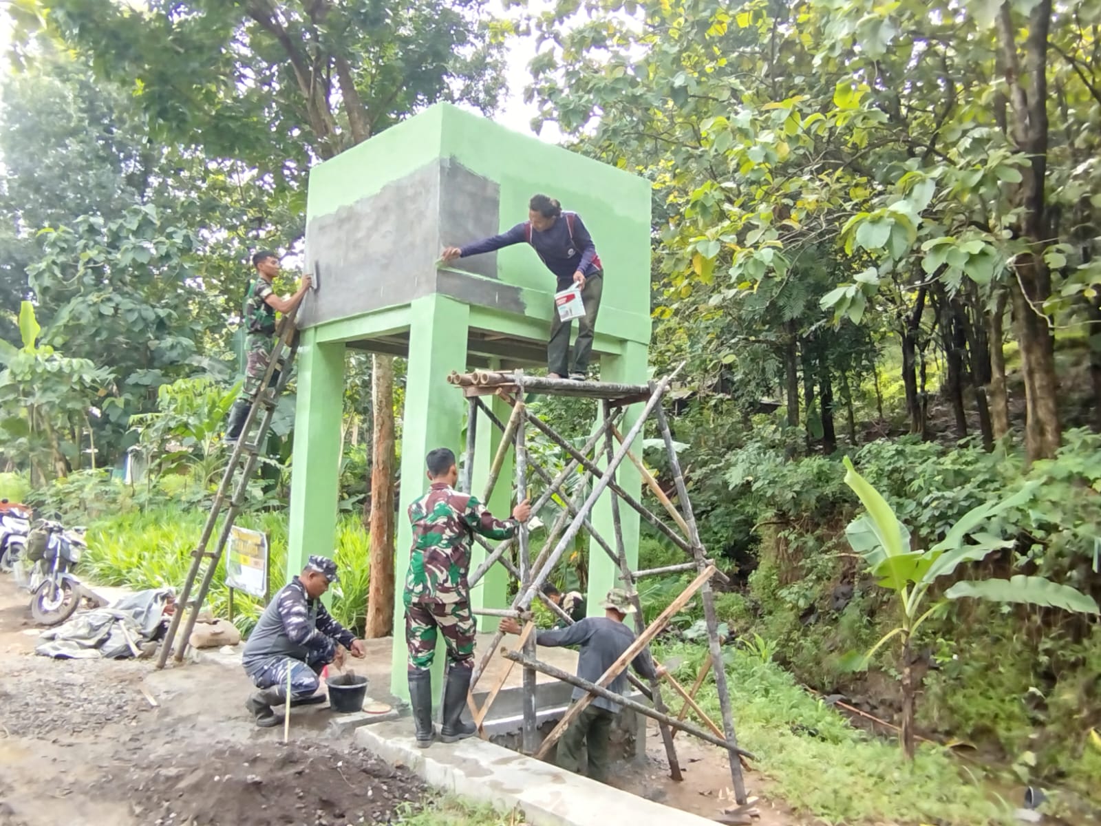 Satgas TMMD bersama penduduk setempat terlihat sangat teliti dalam mengaplikasikan cat khusus kedap air (waterproofing). Penggunaan material ini bukan sekadar untuk mempercantik bangunan, melainkan sebagai langkah teknis guna melindungi struktur beton dari rembesan serta memastikan tidak ada air yang terbuang akibat kebocoran.