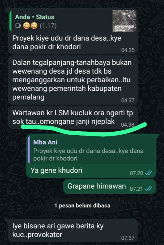 Pemalang — Ucapan bernada kasar yang ditulis oleh salah satu perangkat Desa Tanahbaya melalui pesan WhatsApp kini menuai reaksi keras dari kalangan wartawan dan lembaga swadaya masyarakat (LSM). Mereka menilai pernyataan tersebut merendahkan profesi jurnalis dan aktivis pengawas publik.