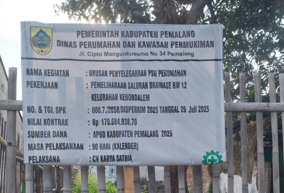 Proyek tersebut dilaksanakan oleh CV Karya Satria di bawah Dinas Perumahan dan Kawasan Permukiman Kabupaten Pemalang, dengan nilai kontrak sebesar Rp 179.684.938,70. Berdasarkan papan informasi proyek, kegiatan ini dilaksanakan selama 90 hari kalender sejak diterbitkannya Surat Perintah Kerja (SPK) Nomor 000.7/2058/DISPERKIM/2025 tertanggal 25 Juli 2025.